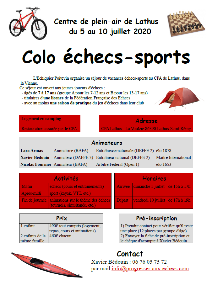Avec l’Échiquier Poitevin j’organise une colo pour les 7-17 ans.Les participants sont répartis en deux groupes d’âge A et B pour les activités sportives, et en 3 groupes de niveau pour les échecs. Les réservations auprès du Centre de Plein-Air sont faites, il y aura finalement 16 places.Au 16 avril, 13 places sur les 16… Poursuivre la lecture Colo échecs-sports à Lathus du 5 au 10 juillet 2020
