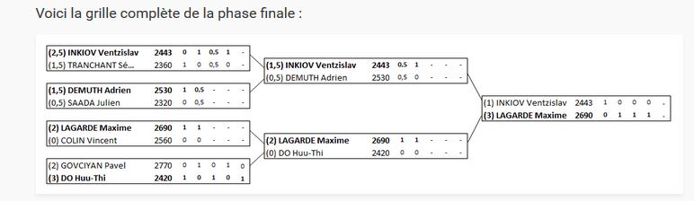 Le festival a été un succès, on s’est tous bien amusés que ce soit en blitz, en simultanée ou en système basque (deux parties en même temps contre le même adversaire). Le compte-rendu détaillé du festival par Sébastien Tranchant sur le site de Poitiers-Migné. Bravo à Maxime qui l’emporte 3-1 en finale contre Ventzislav Inkiov… Poursuivre la lecture Festival de Poitiers : Maxime Lagarde remporte le blitz