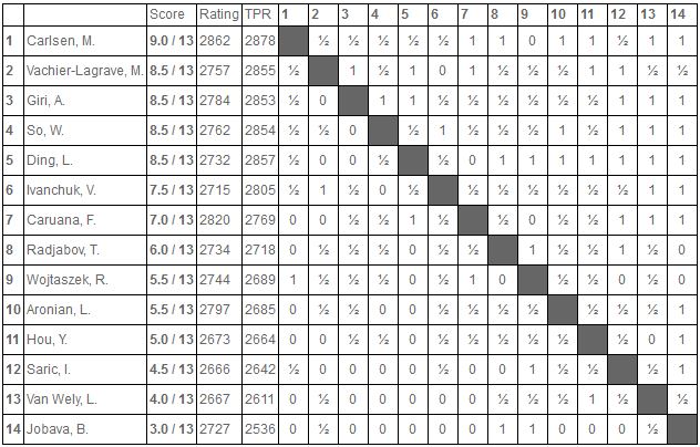 Le numéro 1 français Maxime Vachier-Lagrave continue sa remontée vers le top 10 mondial. Il bat brillamment Caruana à la dernière ronde (partie Caruana-MVL) en sacrifiant un pion pour les cases noires et prend une 2ème place méritée.