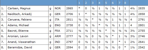 La victoire du Champion du Monde a été difficile, à cause d’une défaite ronde 3 contre le numéro 1 Allemand Naiditsch. Ensuite les deux joueurs ont bien marché, et au bout des 7 rondes ils étaient premiers ex-æquo avec 4,5 points. Le départage en parties rapides a été très indécis, et Carlsen s’impose lors de la 5ème partie, en armageddon.
