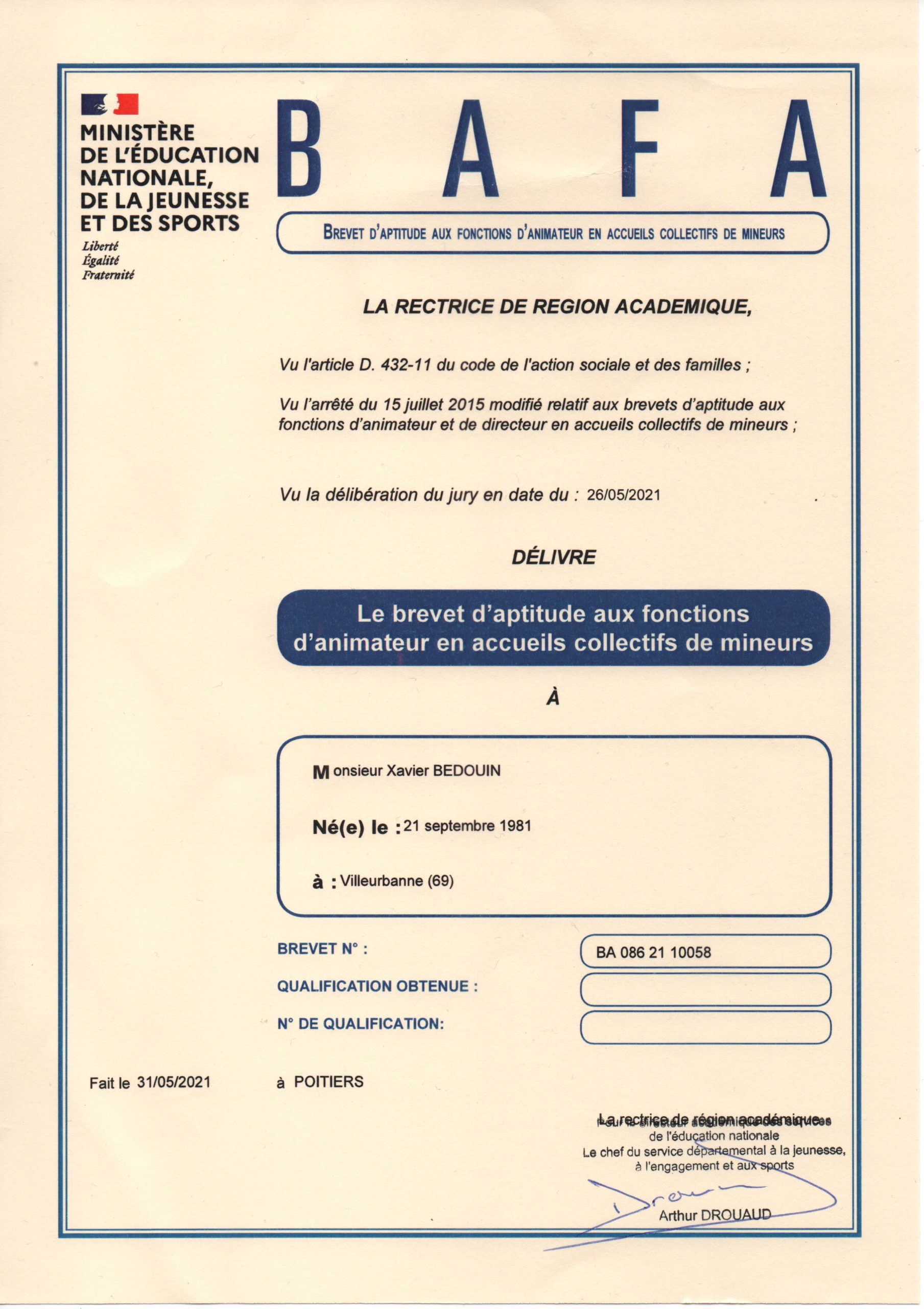| 2021 | février | Brevet d’Aptitude aux Fonctions d’Animateur (BAFA) |